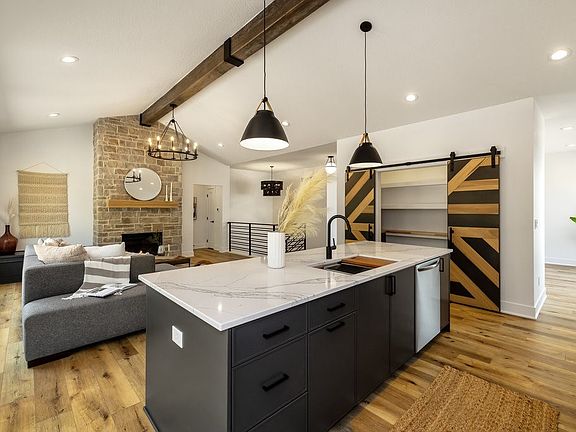 Presenting the Frampton Homes 2022 Make A Wish Charity Home! A charming front porch & 8' double front door invite you in to the open floor plan flooded w/light from the oversized windows. A beam on the vaulted ceiling & fstone FP surround add character. The kitchen features a large island, soft-close cabinetry, quartz countertops, SS appliances & walk-in pantry w/tons of storage & custom barn doors adding interest & functionality. A large 3 panel slider leads to the composite, covered deck. Custom lighting & tile backsplash add more interest! The open dining room has plenty of space for entertaining! Split bedrooms give each main floor bedroom a private feel. The primary suite incl a tray ceiling, walk-in closet w/custom organization & 5 piece bath w/comfort height dual vanity, soaker tub, tile shower & water closet w/floating shelf storage. The 2nd bedroom & full bath sit at the front of the home. Custom mudroom bench adds more visual interest & separate laundry room complete the main floor. Don't miss the 4 car garage- fully insulated, vaulted 2 stall bay w/basketball hoop, second 2 stall bay plumbed for a gas heater, 8' insulated doors, quiet openers w/wifi & side access walk door. The lower level incl a large family room, wet bar, 2 addt'l BRs, bath & TONS of storage. A whole house humidifier & dual zone HVAC add to the energy efficiency of the home w/2x6 construction & irrigation to keep your yard looking great. All info obtained from seller & public records.