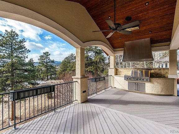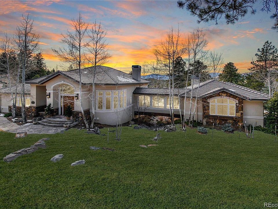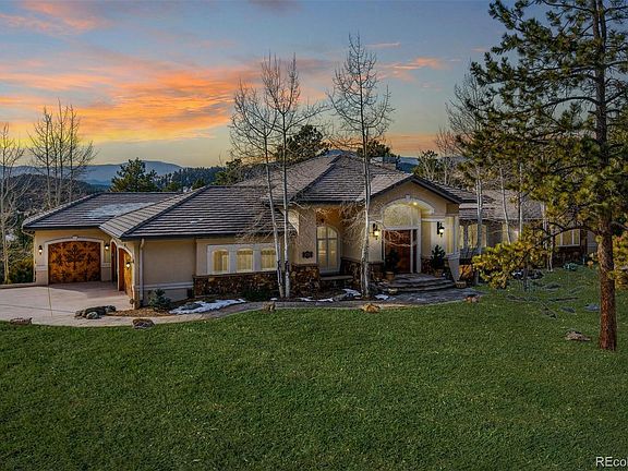 Nestled on 10 acres in the foothills of an exclusive & private neighborhood is this exquisite manor style home. Finished w/ a flourish of European flair, this is a residence fit for those who prefer the finer things in life. Architectural perfection awaits & has been paired perfectly w/ exceptional custom detail including the dining room's barrel ceiling & the 1200-bottle wine cellar that was featured in Wine Spectator. An impressive 6,835 sqft of living space includes a sprawling master suite wing & fully-finished basement. Living spills outside to a large covered deck w/ heaters & sweeping views of the surrounding landscape. Enter through a grand foyer w/ a slate floor & bold archways leading into the dining & living room. A wet bar connects the dining space to the gourmet kitchen. The home chef will relish the suite of quality appliances including a 6-burner cooktop & warming drawer, as well as an abundance of storage & sunny breakfast nook w/ a bay window. The living room has a beautiful fireplace & walk-out to the deck. A glass walkway connects the main living areas to the master wing that is home to the master bedroom, dressing room, stunning master bath, office & laundry room. Two more bedrooms are located in the finished basement, along w/ a 2nd laundry room & a Jack-&-Jill bath. For the avid entertainer, the lower level offers a huge family room w/ elegant fireplace, large wet bar, half bath & billiard room. There is also a fitness space w/ large mirrors for those who like to keep active year-round. As one would expect in a home of this caliber, extra features abound. Enjoy a whole-home Lutron lighting system, whole-house water filtration system, heated driveway and path and a 4-car garage w/ storage & a workshop. Home to a roaming herd of over 100 elk, this hidden oasis is located within a sprawling neighborhood filled with large, wooded lots. Just 5 minutes from the I-70 at the Chief Hosa exit & less than 30 minutes from Downtown Denver & Cherry Creek.