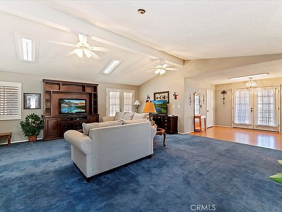 What a fabulous home in Sun Meadows! The premier 55+ community in Menifee! You don’t want to miss this one! This unique floorplan with 1440 sq. ft. has 2 bedrooms and 2 baths. Walk into the front door and enjoy the Greatroom design complete with a formal dining room! The Greatroom area is huge with skylights and French Doors to the backyard. This home has been well taken care of. The 2 bedrooms are separate and at different areas of the home for maximum privacy inside the home! The kitchen is compact with built-in gas stove top and double ovens. Plantation Shutters, Skylights, Ceiling Fans, Corian Counters just to name a few of the upgrades that adorn this home. At the back of the park, it has an unusually large lot that even includes a putting green for the golf enthusiast! The French doors in the Greatroom and Primary Bedroom lead to the very large pie shaped backyard with alumawood covered patio, an 8X8 Tuff Shed that will convey with the home. The best part is the putting green for the golf enthusiast! Compare it with others in Sun Meadows and you will fall in love. Sun Meadows has plenty of amenities to live the staycation life every day. Pool, indoor spa, clubhouse with kitchen area, billiard room, card room, craft room, indoor shuffle board, park, pickle ball courts, the list goes on!! Buyer will need to be approved for the monthly land lease.