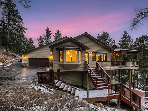 Sheltered in the trees, this stunning mountain home, located on almost 3 acres in the Conifer Park Estates subdivision, yields an abundance of unique surprises. As you walk into the updated dining, living, and kitchen area, you will discover gorgeous mountain vistas while warming next to the cozy fireplace. This sophisticated retreat boasts new appliances, an open kitchen design, and spacious outdoor living areas. Entertaining and relaxing features elegantly merge in this stunning mountain home. The main floor has two bedrooms, a full bathroom with two sinks, and a powder room. The master suite is an upstairs sanctuary, complete with a spa-like bathroom and a private balcony overlooking the mountains; perfect to enjoy morning coffee or tea. Once downstairs, creatively utilize the three non-conforming bedrooms for office space, a home gym, or rooms for your family or guests. Plus, a magnificent family room centers downstairs, complete with a gas fireplace and another full bathroom. Also, downstairs is a wonderful surprise of a second fully functional, partial kitchen (ideal for entertaining or inter-generational living). So many amazing updates await you. Outside, you will find ample space for outdoor living with a covered deck and a patio. Enjoy evenings in the included hot tub in all four seasons. Colorado sunshine brings an abundance of energy to the included solar panels; and yes, they are owned outright and not under a lease! Incredible utility savings; this is a great way to offset the increased mortgage rates. A great perk for clean energy in this beautiful mountain retreat that is only minutes from shopping, restaurants, and excellent, highly-rated schools. Great access to highway 285 and Highway 73 for an easy commute. Even though there is a short one-lane road right before the home, there are only a few houses after this home and the road is quiet. The sun melts it nicely and the residents maintain it beautifully.