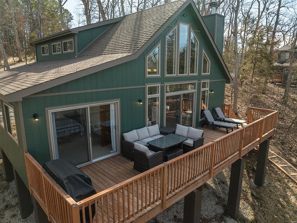 For those seeking a fun filled getaway or a quiet and peaceful retreat, this lakeside chalet offers the perfect blend of comfort and luxury. Stepping inside, the warm atmosphere is highlighted by the stone fireplace and gorgeous LVP floors. Light abundantly fills every room and the picture windows bring the outdoors in. All modern comforts included in the well appointed kitchen. Dine or play games in the oversized dining room. Retreat to anyone of the four spacious bedrooms - 2 on main and 2 up. Create an office space or kids play area in the loft. Huge towering oak trees and bright green cedars dot the natural landscape. Recount the days adventures over a cocktail at the custom boulder firepit. Create new adventures swimming from the private lakeside dock. Frieden lake is stocked for fishing and perfect for kayaking too. This property comes fully furnished (minus a few exclusions) and is rental ready if desired. Lifelong memories are made here!