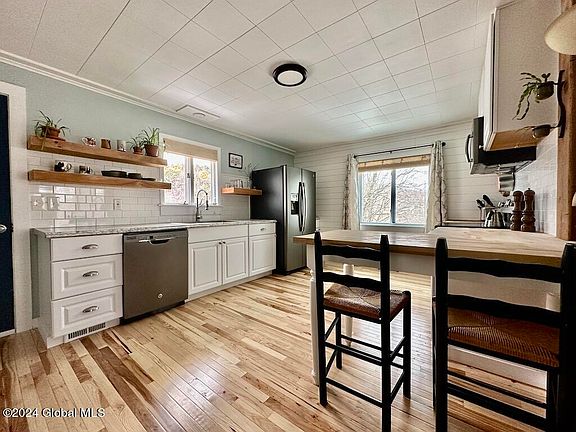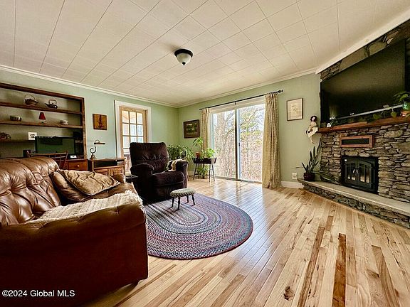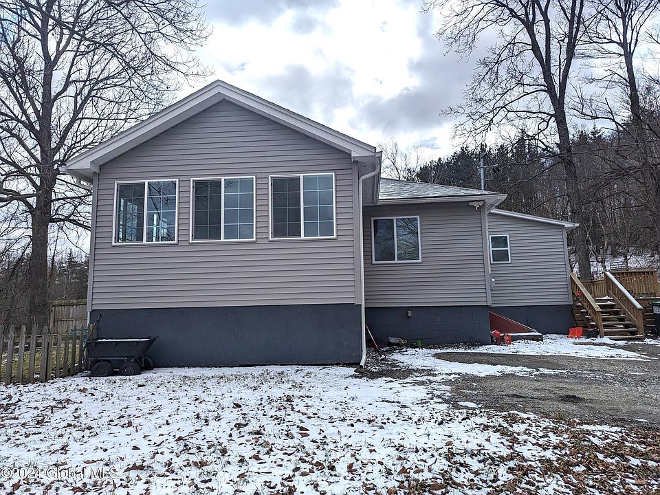 Fall in love with this charming ranch w/ stunning Mountain views! This home has a bright open floor plan w/many tasteful upgrades throughout. When you walk inside you will see true craftsmanship at its finest. Great room features HW floors, built-ins bookcase, fireplace w/stone surround perfect for those chilly winter nights. The kitchen includes ss appliances, tile backsplash and butcher block countertop. Custom bathroom w/ceramic tile flooring, fully tiled shower w/glass shower door and freestanding tub! The bonus room has tons of natural light w/a wall of windows, vaulted ceiling, recessed lighting, custom wood paneling and trim work. This room can easily be converted to a 2nd bdrm. Fenced in backyard w/stone patio and firepit perfect for entertaining! Also, a detached garage and shed!