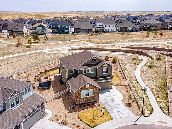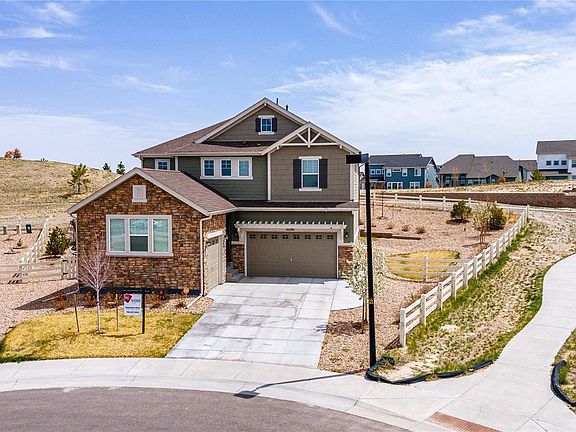 Beautifully finished William Lyons home on a cul-de-sac in the highly sought out community of Southshore! As you step into this home you will find a vaulted entryway that feeds into the open flow kitchen and living area. The Gourmet Eat-In Kitchen features a large island with white soft-close cabinets, stainless steel appliances, under-mount cabinet lighting, quartz counters, statement pendant lighting and a decorative tiled backsplash. The Kitchen opens to the main living area that has built in shelving and cabinets, and a cozy fireplace for you to enjoy. On the main level you will also find an office with french doors for more privacy. As you step up the stairs you will find 3 secondary bedrooms, a secondary bathroom with decorative flooring and a spacious laundry room with tons of built-in storage. The Primary Suite features a tray ceiling and a ceiling fan. In the Luxurious Primary Bath you will find dual vanities with quartz counters, an oversized dual head walk-in shower with Euroglass and a spacious walk-in closet. All of this can be yours! Situated on a cul-de-sac on a 10,000 square foot lot backing to walking trails and open space. This backyard oasis features a covered patio , a built-in fire pit with a stamped concrete area, fully fenced with lots of privacy! Living in this community gives you access to 2 clubhouses, 2 pools, walking trails, new dog park and beautiful parks. Close proximity to Altitude Elementary, Southlands, and E-470!