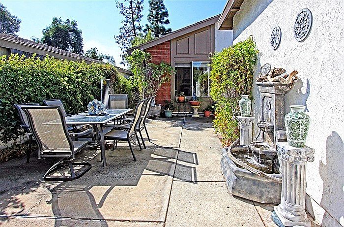 There's no place like home! This charming residence occupies a peaceful cul-de-sac position near the desirable Carl Hankey schools. Upon entering the front gate, the quiet, private courtyard with tranquil waterfall feature will help you forget your daily stress. Opening up the front door reveals a bright, open living room with a cathedral ceiling and unique stamped concrete flooring, a freshly painted, spacious kitchen/dining area with updated tile flooring and inside laundry, updated flooring can be found in the guest bathroom, a master bedroom complete with ensuite, two more bedrooms with one opening up to the serene front patio, cooling air conditioning for the summer heat, a lush backyard with calming birds chirping amongst the lemon and plum trees and retains the value of peaceful living while being conveniently close to the Shops of Mission Viejo, Hospital and newly appointed Shuttle.