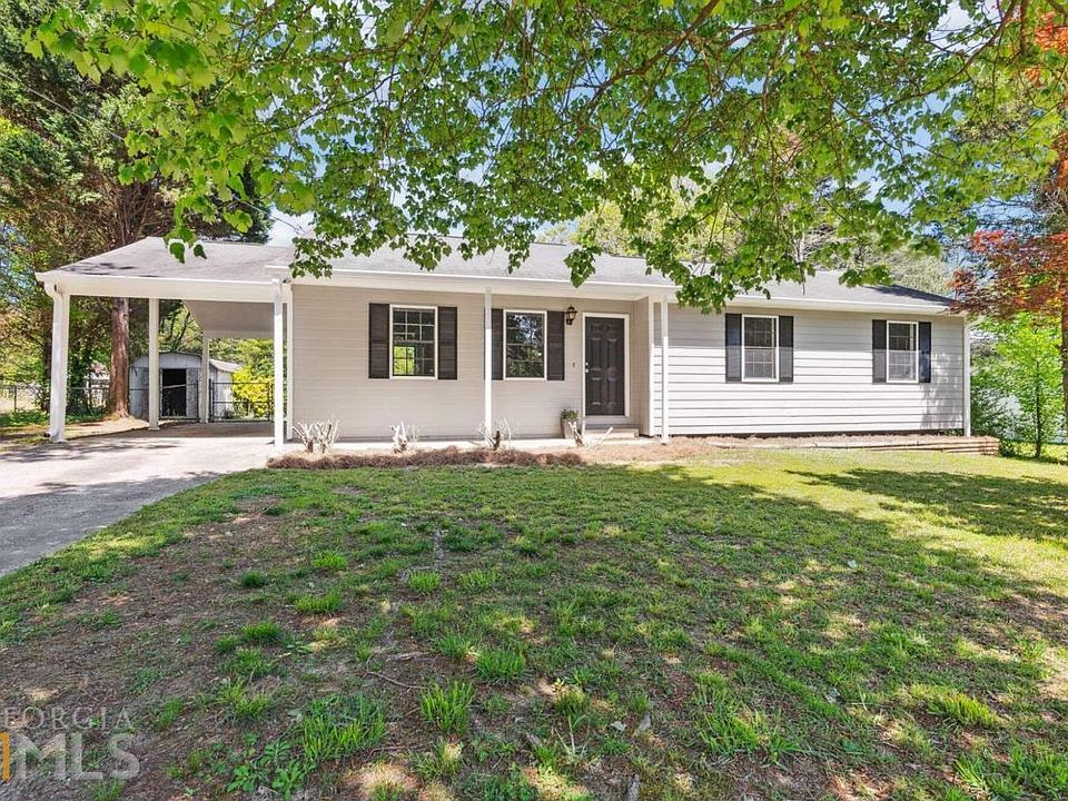 Updated and Move-In Ready! Cute 3 Bed / 2 BA Ranch on a huge level yard in a quiet West Cobb neighborhood! NEW exterior & interior paint! NEW flooring & carpet throughout! Updated kitchen with stainless steel appliances! Updated primary bathroom! Covered front entryway opens to a spacious great room with big windows that bring in lots of natural light! Main living areas flow seamlessly in this cozy one level home. Refreshed eat-in kitchen has updated crisp white cabinets, newer countertops and SS appliances including a NEW dishwasher and microwave! Dining area has sliding doors leading out to the big deck and backyard! Primary bedroom features a large closet and updated bath with NEW vanity! Sunny secondary bedrooms have generous closet space and share the hall bath. Convenient laundry room off the kitchen has access to the backyard making this a great space for a mini mudroom! You'll find endless potential in the big fenced yard, there's plenty of room to garden, host summer cookouts or just let kids and pets run around! Mature trees and greenery provide privacy while you relax on the oversized deck! Keep your lawn equipment and tools within reach in the storage shed. One car carport. Minutes to Barrett Pkwy with easy access to Historic Marietta Square, Truist Park & I-75!