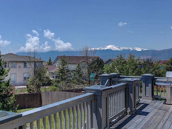 Beautiful 1-owner Pine Creek ranch style home. 6 bedrooms 3.5 baths. Biggest lot on the street, 1/3 acre of fenced-in space on the quiet cul-de-sac. Stunning unobstructed views of Pikes Peak and the Front Range. Walking distance to award-winning schools. Modern kitchen with extra-large pantry and hardwood floors. New granite counter tops and updated appliances. Large master with full 5-piece bath including an oversized jetted tub, large walk-in shower and 2 walk-in closets. Double-sided fireplace with heated blower. Lots of built-in shelving. Basement is garden level and has 3 bedrooms and plenty of storage. Finished wine cellar. New carpet throughout and a new roof. Whole house stereo system and living room, master and rec room all wired for surround-sound. Two bedrooms have low maintenance tile floors, perfect for bedroom or office space. Bedrooms 2 and 3 share a jack-and-jill bath. Dual furnaces, central A/C and humidifiers. New easy upkeep composite deck to enjoy the views from while using the natural gas BBQ.