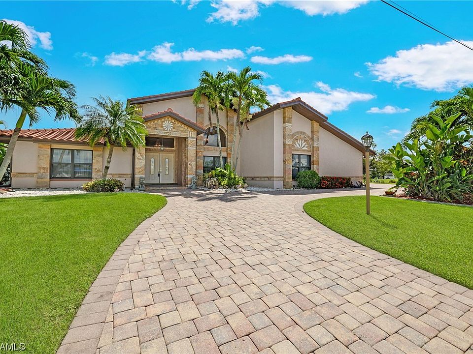 The home features 16 ft ceilings in the living room and dining room, 3,643 Sq Ft under living area, 6,298 Sq Ft of total area, formal living room, a family room, 3 master suites, a large kitchen with an eat-in kitchen, a wet bar, fireplace, an outside cooktop, tile throughout, a large sink in the garage, 3 car garage plus 1 extra car space for storage, a Pool, 145 Ft on the water, a circular paver driveway, and extensive tile work outside and inside of the house. Most all the windows are hurricane-impact windows and hurricane-impact sliding doors, and no flooding, and minimal damage during Ian. Come and take a look.