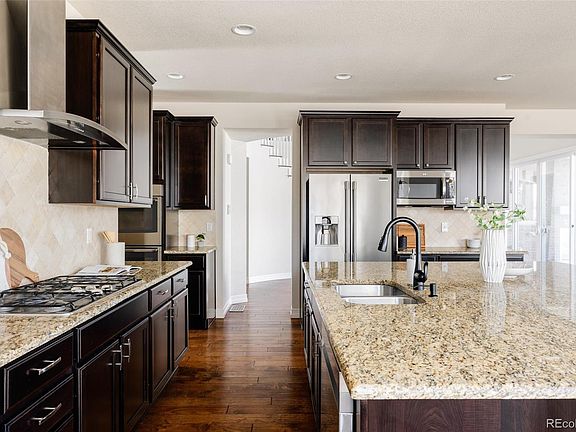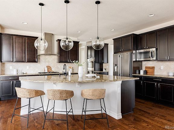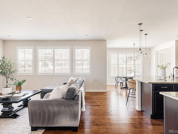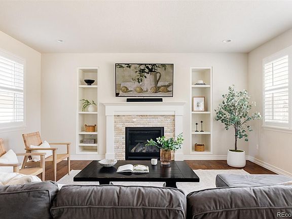 Exceptional home in the Southshore community, where "Life at the Lake" meets modern luxury. Just moments from the Aurora Reservoir, this home is designed for effortless indoor-outdoor living with high-end finishes throughout. As you arrive, a covered front patio with a cozy fireplace sets the tone for relaxation. Step inside to a grand foyer featuring a built-in bar with two beverage fridges—perfect for entertaining. A double sliding glass door off the entry opens to a private courtyard with a fireplace. Beyond that the open-concept living area is both elegant and functional, centered around a sleek gas fireplace with custom built-ins on either side. The gourmet kitchen is a chef’s dream, boasting double ovens, abundant cabinetry with pullouts, granite countertops, high-end stainless steel appliances and a spacious pantry. The dining area is anchored by a modern statement chandelier, while French doors lead to a spacious sunlit home office. Gorgeous hardwood floors flow throughout the main level, complemented by Hunter Douglas plantation shutters throughout. There is also a built in mudroom area that leads to the three car garage just off the kitchen. You’ll also locate a powder bath on the main level. Upstairs, the luxurious primary suite features blackout shades, a spa-like five-piece bath with a glass encased shower that features a bench and dual shower heads, as well as a large soaking tub, and a generous walk-in closet with direct access to the laundry room. Three additional bedrooms complete this level—two connected by a Jack-and-Jill bath and one with its own en-suite. The beautifully landscaped backyard is a private retreat, filled with lush perennials and multiple patios, including a back patio with a natural gas connection for grilling. Located within the top-rated Cherry Creek School District and zoned for Altitude Elementary, this home is ideally positioned between both community pools and clubhouses, with a new dog park just steps away.