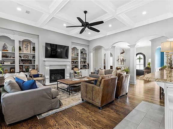 - Description: gas logs, coffered ceilings, built ins,Flooring: Wood