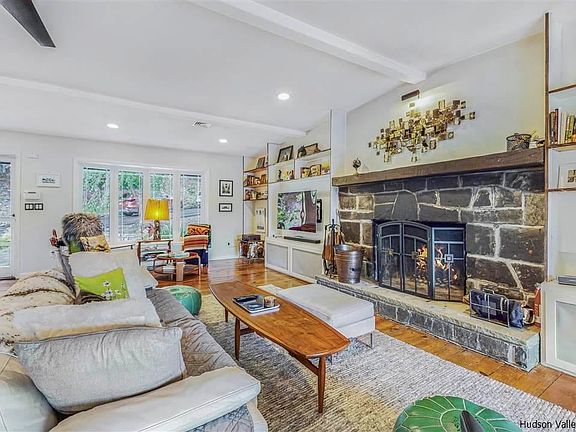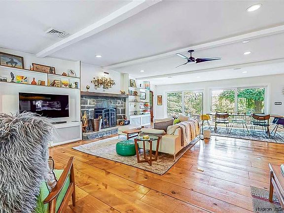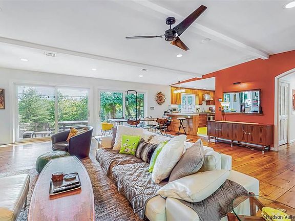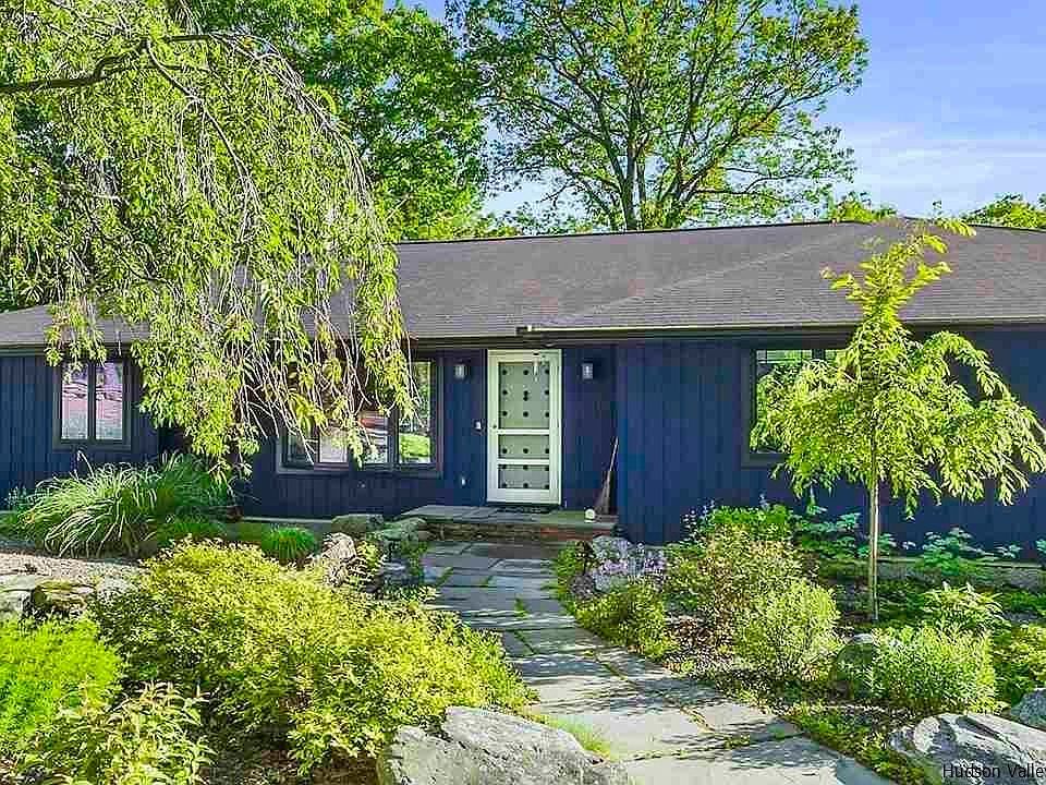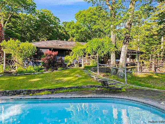 Hidden from sight yet minutes to Woodstock Village is your very own mountain compound with a mid-century 3 bedroom one level house plus separate 1 BR guest house all on 12+ magical acres located adjacent to the Byrdcliffe Art Colony. With no neighbors in sight, drive up your newly paved driveway to the top and take in the views and sounds of silence. Enter into an open and airy living space with an updated kitchen, wood floors, stone fireplace and wall of windows out to the bluestone patio, fire pit and gunnite pool. The main house features a primary bedroom with a large walk in closet, and an expansive en suite bath with separate shower and soaking tub on one end. On the opposite end of the open Living/Dining/Kitchen area are two more bedrooms and a full bath, offering adequate privacy between bedrooms. A lovely screened in porch off the kitchen overlooks the pool and seasonal mountain views beyond. Views could easily be expanded with some select clearing. The guest cottage is spacious and bright, cute as a button with its very own fireplace and separate bedroom. For those who want a separate work from home space this is ideal- only steps from the main house so the commute is short, but no more working from the kitchen table while others are at home! There are no visible neighbors from this property and yet you are within 5 minutes of Woodstock or Bearsville. Just around the corner is the Byrdcliife Art Colony which hosts artists in residence programs as well as ceramics classes, theatre performances and is a lovely place to walk or hike up Mt Guardian. This property is really the best possible place for any nature enthusiast, or anyone who is seeking space to spread out, abundant sunlight in their home, fresh air and peace and quiet. Top it off with the luxury of a great chef's kitchen, screened in porch and an in-ground pool. Have it all here! The home was built in 1965 by a legendary advertising executive (Think Mad Men!), who fell in love with the property and remained there for over 40 years. He travelled a lot and imported the antique stained glass doors to incorporate into the house in the early 70's. These were traced back by the current owners to an antiques dealer in Manchester, UK. Below the main house, mid way up the driveway is an old stone foundation from what was likely the original homestead from the 19th Century. With town approvals one may want to explore the possibility of another structure. Possibly an art or recording studio which the sellers were planning to do if they stayed. The property is bursting with possibilities, or do nothing more and simply enjoy!