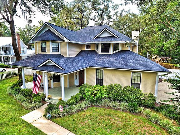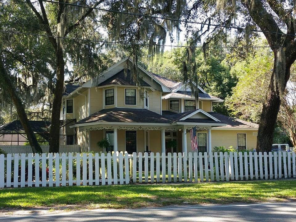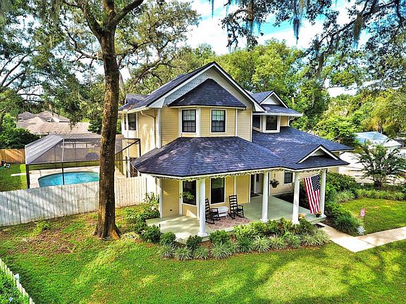 Beautiful Victorian pool home in historic old Mandarin surrounded by a nicely manicured yard and canopied oaks. A charming white picket fence adds to the curb appeal with a large front porch, columns, bay windows and ornate exterior trim to reflect the historical design. Just inside, you're greeted with a two story foyer and an Oak staircase. The hardwood flooring leads you into the formal living and dining room areas. High ceilings and crown molding throughout the main level! The upgraded kitchen features granite counters, prep island, stone backsplash, stainless steel appliances, and an eat-in area open to the living room. Enjoy cozy nights next to the wood burning fireplace in the living room or your morning coffee in the tiled screened patio just off of the eat-in area.