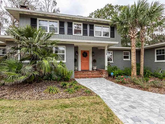 Once you step foot into this charming home built in 1942 in the historic Golfview Estates neighborhood built by the Anderson family of UF Anderson Hall, you will be at home. Located next to the University Golf Course and Lake Alice, you can walk to campus for games and other events. This home has character and features everything you would expect, beautiful built ins, warming fireplace, crown molding, and true hardwood floors. The kitchen has all stainless steel appliances and opens up to the dining room.Between dining and living room, a serving pantry/bar is perfect for entertaining. The expansive Florida room, with Saltillo tiled floors from Mexico and wood paneled ceiling, spans the entire main living area and opens up to a hardscaped patio and lush, completely fenced in back yard. Beautifully landscaped by Entropics and meticulously maintained, the back yard is the perfect spot for outdoor entertaining. The master bedroom and bath are located downstairs as well as an additional bedroom or study and a second full bath. Upstairs you will find two large bedrooms connected by a Jack and Jill bathroom and an additional room that would be great as an extra bedroom, playroom/media room, or hobby room.