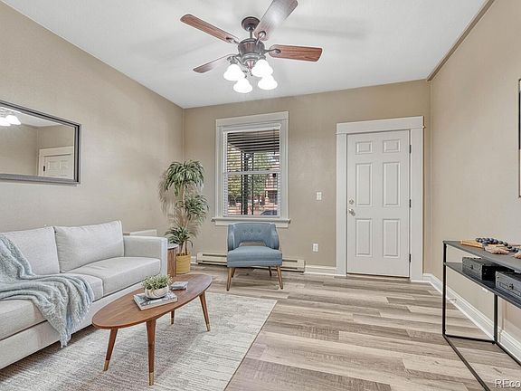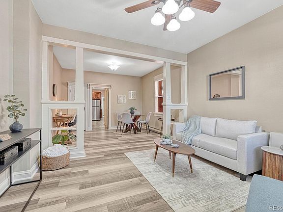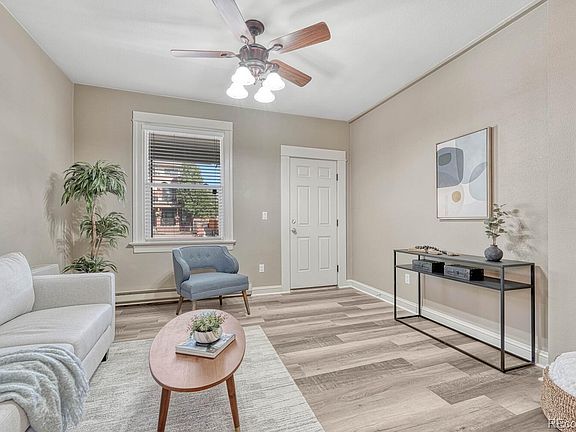 This charming ROW home in Denver's Potter Highlands is a delightful blend of historic charm and modern updates. The welcoming living room is bathed in natural light, with decorative lighting, a ceiling fan, carpet, and harmonizes beautifully with the original woodwork. The high ceilings, newer trim, doors, and windows add to the features this property affords. Enjoy the additional space that can be used as a dining area, in-home office, or just that added flex-space to fit your everyday lifestyle. The efficiently laid out kitchen is designed with ample space for a cozy nook, features a sizable pantry, modern lighting, alder-wood cabinets, flooring with neutral tones & colors, and a striking stone backsplash. Adjacent to the kitchen, you will find a separate laundry and storage area, adding to the home's practicality. The spacious bedroom offers plenty of closet space, a ceiling fan, and a private entrance to the patio. An updated full bath completes the interior, ensuring convenience and comfort. Outside, the private, fully fenced yard & patio, with a storage shed and off-street parking for two vehicles add that extra value to this property. No HOA!! Located just a few blocks from Highland Park, within easy reach of Highland Square, its shops & restaurants, this home is only minutes away from Sloans Lake, Downtown Denver, Ball Arena, and provides convenient access to I-25. An excellent choice for investors or primary