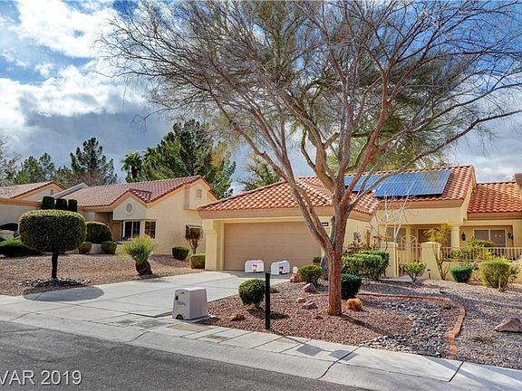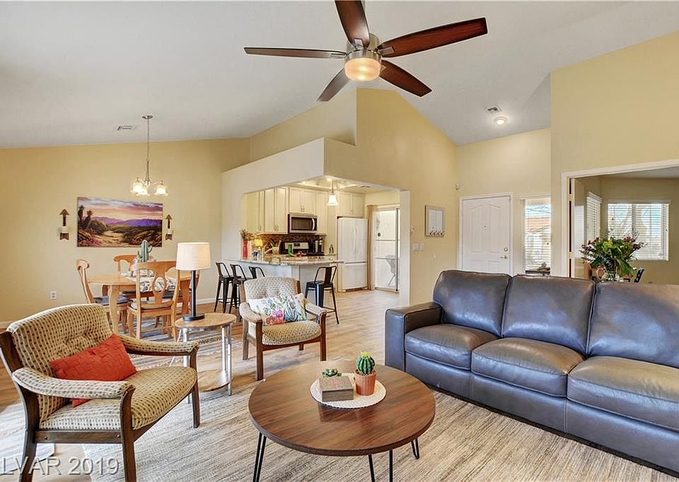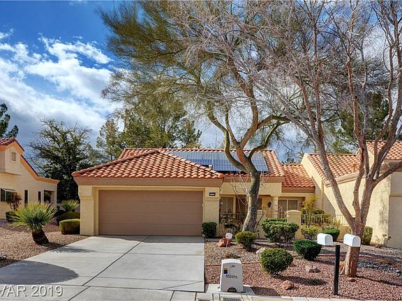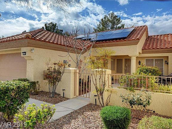 Stunning in Sun City Summerlin. This 2 bedroom townhome has been remodeled to impress. The kitchen has been opened up, adding custom cabinets and new counter tops, along with beautiful laminate flooring throughout. Enjoy the gated courtyard entry and the openness of the unit. The home operates efficiently, thanks to the Tesla solar system on the roof. All within the confines of Sun City Summerlin, and its endless recreational opportunities.