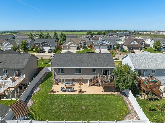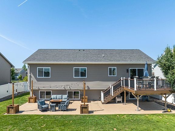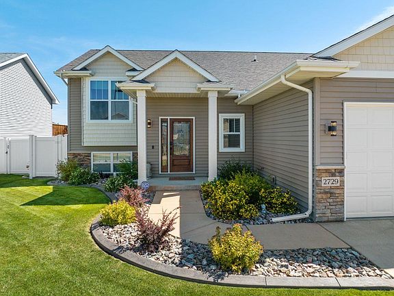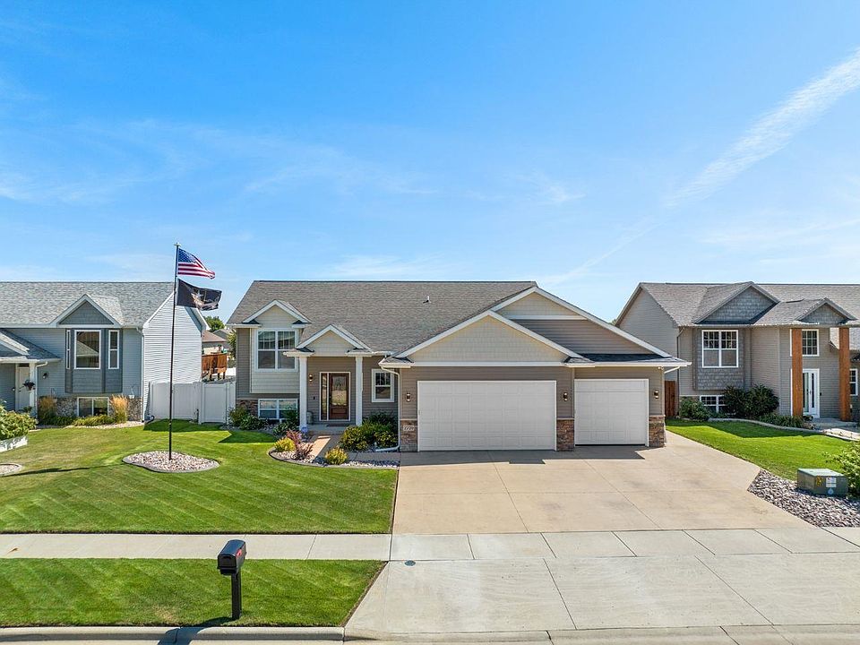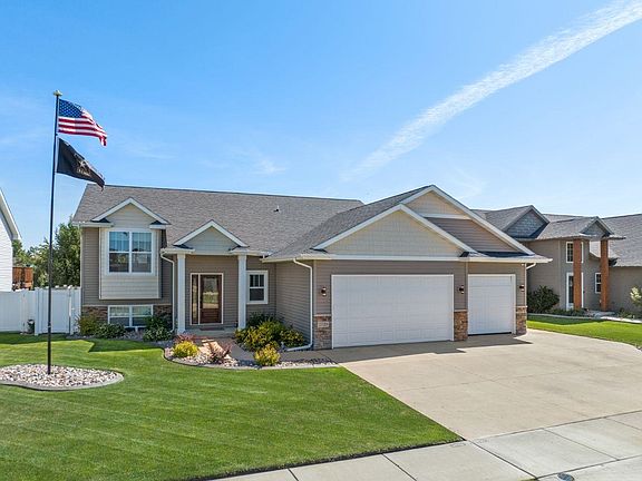 Welcome to beautiful Eagles Landing in Northwest Minot. This well maintained split foyer home sits on a wonderfully landscaped lot with privacy fence, in ground sprinklers, stamped concrete patio, a mature foliage blocked deck, hammock pergola, three stall garage, and prominent flag pole. Inside you are greeted by a large entry with coat closet. On the upper floor you will find high ceilings, natural light, and access to your backyard. The kitchen features loads of cabinet space, large kitchen island, 40 inch uppers, and stainless steel appliances. The open concept living, dining, and kitchen area is ideal for entertaining. The luxury vinyl plank flooring makes for a durable, waterproof space. Down the hall you will find an updated hall bathroom and two spacious secondary bedrooms. The primary retreat can accommodate any furniture configuration and the walk-in closet can fit an army. The primary bathroom is the star of this room with double vanity and space for everyone to start their day. Down to the lower level, brace yourself for the custom bar with beautiful granite countertops, built-in beverage refrigerator, tile flooring and loads of storage. The family room is large enough to accommodate the most comfy furniture and an air hockey table. There is no shortage of fun or relaxation on this lower level. The lower level also features two more secondary bedrooms, large laundry room, and lovely hall bathroom with a tiled walk in shower. This property is not just move in ready, but ready for you to call home! Call for a showing today!