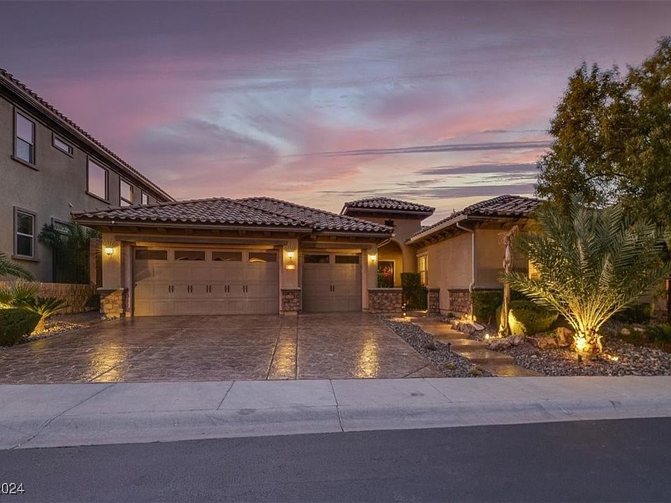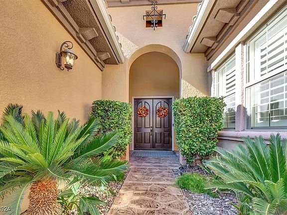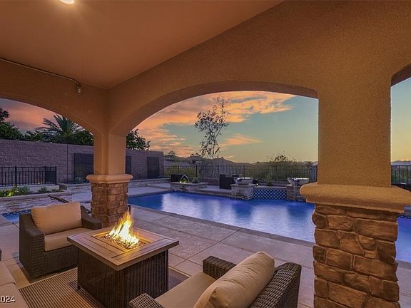 Enjoy Beautiful Sunsets from this Upgraded Single Story in Guard-Gated Private Club Madeira with Pool, Spa and *Views* of the Mountains, City & Las Vegas Strip - Open Concept Floorplan with Lovely Travertine Flooring, Large Granite Island in Kitchen with Cherry Cabinets, Stainless Steel Appliances & Dual Ovens overlooking Family Room with Fireplace, Built-In Entertainment Center and Coffered Ceilings - Butler Pantry with Wine Cooler leads you to Formal Dining Room - Primary Bedroom is Separate from Others with Elegant Entrance and HUGE Bathroom boasting a Walk-In Granite & Glass Shower, Roman Tub, Dual Sinks, Vanity & Walk-In Closet - Property boasts a Stamped Concrete Driveway & Walkway, Grand Foyer Entrance, Plantation Shutters, 3-Car Garage with Epoxy Floors & Overhead Storage - Amazing Backyard with Covered Patio, Pool, Spa, Water Features & Elevated Seating Area to Enjoy the Views - Upgraded Lighting with Dimmers, Water Softener