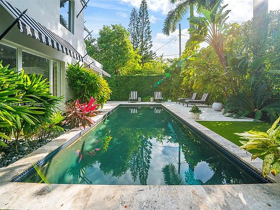 Modern upgradesConverted garageStunning original detailsMedia roomTropical landscapeSerene pool areaWide arched doorways