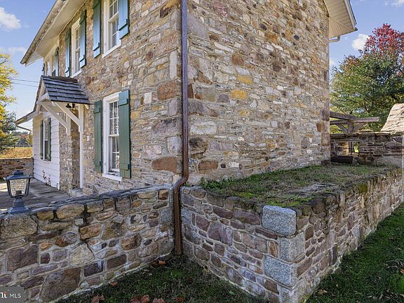 Located in beautiful Solebury Township just above New Hope and slightly below the lovely village of Stockton, New Jersey. The Wishing Well House   Circa 1858 fieldstone home and its companion log cabin sit on approximately 1.49 acres in an area surrounded by fabulous estates and outstanding beauty! The charming stone home features an abundance of windows letting the sun flood its charming rooms. Some of its attractive features are wood floors throughout, living room with stone fireplace, hearth and wood stove insert. The dining room has eye catching corner cupboard. A very cook friendly remodeled kitchen provides ample workspace with lots of raised panel cabinetry, granite counters, & newer G/E. stainless appliances and utility closet. There is a convenient laundry with newer full size G.E. washer & dryer. A coat closet and half bath complete the first floor. An atrium door takes you to an enclosed patio with massive stone table and seating. This relaxing area is surrounded by remarkable stone arch entrance, extensive stone walls, and large overhead beamed trellis offering a relaxing place to entertain & enjoy seasonable alfresco dining. The second floor offers 2 bedrooms and a newer full bath with granite counter vanity & tub-shower surrounded by classic ceramic sub-way tile. The basement has Bilco type doors. There is a newer heating/air conditioning system & hot water tank + 200 amps. An additional rustic log cabin has all the trappings you would expect. Wide pine floors, cathedral ceiling and stone fireplace with pellet stove insert add to the living room/dining’s aesthetics. Newer appliances include Frigidaire refrigerator & G.E. stainless appliances and a mini-pantry storage closet. The adjacent large bedroom with exposed log walls, pine floors, a door to the exterior is complemented by an oversized bow window bringing the outside in. A convenient laundry closet offers newer full size G. E. washer & dryer. The full bath features vanity sink & shower. The newer HVAC system is a heat pump with propane back-up, on demand propane fired Bosh domestic hot water, newer 100-amp service and also Bilco type doors. A recently replaced septic system services both units. A substantial stone detached 2 car garage with 200-amp service provides open ceiling for high profile vehicles, doors at each end and a fixed staircase to the second level providing a myriad of uses, excellent storage and extensive windows. So very convenient to the beautiful Delaware River valley & canal, fine dining, art galleries and cultural events. Easy access to New York, Philadelphia, Princeton