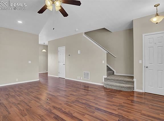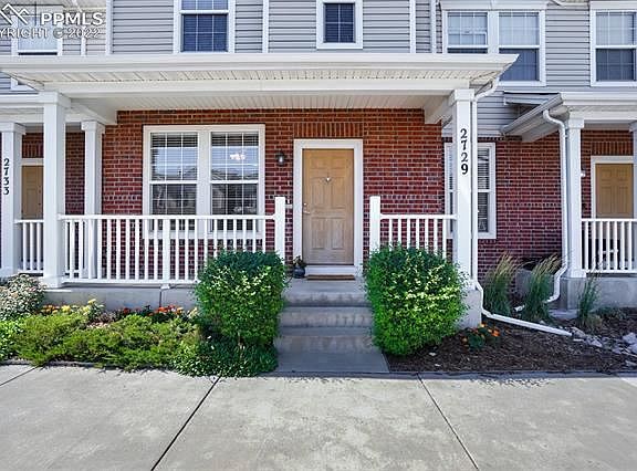 Move-in Ready! Well-maintained 2 bedroom, 2 bath townhome in The Bluffs at Springs Creek, a maintenance-free living community. New interior paint and new carpet throughout! Main level includes a family room and dining area with laminate hardwood floors, a large kitchen with rear deck access, and a guest bathroom. The kitchen has ample cabinet space, a pantry, breakfast nook area, and stainless steel appliances including a double oven and french door refrigerator. Upstairs, you'll find two large bedrooms with walk-in closets, a full bath, and a laundry closet (washer and dryer inc). Tons of great natural light! Central AC. Brand new microwave. New blinds and screens. Covered front porch. Can close quickly! Assigned parking right in front of unit, and ample guest parking as well. Easy access to Fort Carson, Peterson AFB, I-25, and close to shopping, parks and trails.