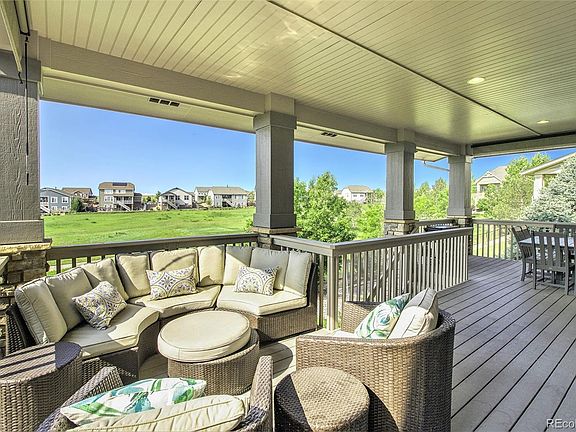 A rare opportunity to call this majestic model home quality home..yours! Perfectly perched on one of the most beautiful and desirable golf course lots in Blackstone Country Club, this spectacular home is loaded with unmatched fine features and quality upgrades As you arrive at this stunning home you will love the elegant courtyard entry with heated concrete and an inviting outdoor fireplace. Upon entry you will immediately be immersed in true elegance and peaceful tranquility with a spiral staircase, soaring ceilings, dramatic second story overlook, and a wall of windows that perfectly frame the amazing outdoor beauty and golf course views. The true gourmet kitchen is sure to please with a perfect combination of Granite counters, upgraded stainless steel appliances, gorgeous cabinetry, exposed wood ceiling beams, double island, and multiple dining areas-Spectacular! The spacious family room is anchored with a rustic stone faced fireplace wall and an abundance of windows that floods the space with natural light. The main floor is complete with a private study, guest bathroom, and easy access to the extended covered deck. The upper level boasts a luxurious and relaxful primary suite featuring a spa-like en suite with a double vanity, huge walk-in shower, and more. There are three additional bedrooms including a full suite with a private bathroom and a shared Jack & Jill Bathroom. The professionally finished walkout basement is an entertainer's dream. This amazing space features a theater area, billiards/game room, bedroom suite, and plenty of storage space. The outdoor space is second to none! The expanded covered deck offers an incredible area to host summer BBQ's or to simply take in the breathtaking golf course views. The park-like setting is amazing in all seasons and features a 10,831 sq.ft. lot with professional landscape. Over-sized 3 car garage, energy efficient Solar Panels, resort-like community amenities. Close to E470, Southlands, and Cherry Creek Schools!