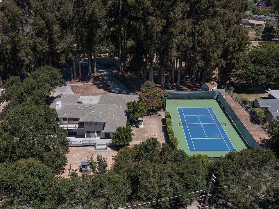 Location! Location! Location! Welcome to your Carmel retreat getaway. Located near the end of a private lane in sunny Carmel, this approximately 4,000 sq. ft. property sits on over 2 acres of flat useable land. This house, built entirely of redwood is light and bright and offers four gorgeous bedrooms, three and a half bath, has a three-car attached garage, an additional garage and ample parking. Enjoy a full-size tennis court, a detached office and an abundance of storage the property offers. This is an entertainers dream home with an enormous great room with bar, high ceilings, Carmel stone fireplace, and is surrounded by a large redwood deck and majestic mountain views. Cook to your hearts delight in the newly updated chefs kitchen complete with a large island and SieMatic cabinets. The oversized master suit offers a large walk-in closet and lovely deck with breathtaking Carmel hill views. This spectacular property is extremely private, fully fenced, gated and peaceful. Want to get a match in? Enjoy a round of pickleball in your very own, private full-size tennis court. This sun-blessed home is on one of the largest lots on Prado Del Sol. This is Carmel living at its finest!