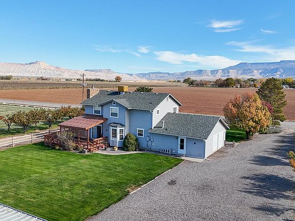 Beautifully maintained 4-bedroom, 3-bathroom single-family home on 4.37 irrigated acres with unobstructed views of the Grand Mesa and Mt. Garfield. Home offers 2,220 sq. ft. of living space with newer flooring, paint, and roof. Kitchen features granite countertops and ample cabinet space. Two spacious living areas provide room to relax and entertain. Property includes a 60' x 43' detached heated shop with bathroom, hot/cold water, refrigerated meat locker, and abundant storage—ideal for equipment, projects, or hobbies. Acreage is irrigated with gated pipe including two alfalfa valves and is currently planted in alfalfa/grass hay. Fruit trees and mature landscaping enhance the outdoor setting and line both sides of the home. Additional features include RV parking, two 30-amp RV plug-ins, and an RV dump, making this property ready for guests or travel convenience. Ample space and infrastructure make this an excellent horse or hobby farm property. Enjoy peaceful country living just minutes from town conveniences!