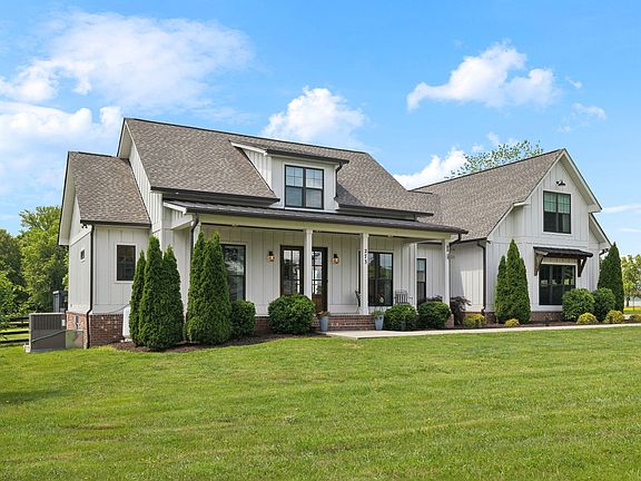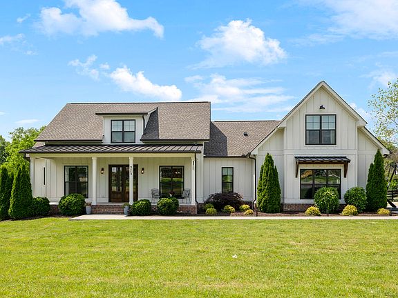 This stunning farmhouse-style home sits on over an acre and offers a thoughtfully designed layout with high-end finishes throughout. The open floor plan features shiplap accents in the great room and breakfast nook, a spacious kitchen with granite countertops, stainless steel appliances, abundant cabinetry, a large island, and a butler’s pantry. The formal dining room is highlighted by a gorgeous coffered ceiling, and 8' interior doors add to the upscale feel. The primary suite is located on the main level and includes a luxurious bath, an oversized walk-in closet, and direct access to the utility room. Bedrooms 2 and 3 share a Jack & Jill bath, while the upper level includes a bonus room, a fourth bedroom, and a full bath—perfect for guests. Outdoor features include a covered rocking chair front porch, a screened-in back patio, and a large grilling area. The fenced backyard is ideal for pets and children. Chicken coop, shed stays! With 4 bedrooms, 3.5 baths, and inviting covered porches, this home is a must-see!