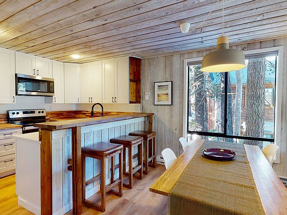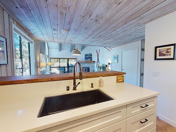 Rare opportunity to own gorgeous, fully redone, furnished and turnkey end-unit townhome, closest to Canyon Lodge at the top of Courchevel away from the street. Leave your car in your private garage and arrive slope-side in 4 minutes, ride the gondola to the village for après-ski or enjoy Night of Lights fireworks from your balcony! Architecture buffs will delight in the late midcentury / early 1970’s mod design featuring vaulted ceilings w/ exposed beams, clerestory & large windows letting in ample light and forest/mountain/ski lift views, split-level w/ main bdrm overlooking sunken living rm and rough sawn cedar throughout. Upgrades include beautiful new kitchen w/ soft close cabinets, quartz stone and acacia butcher block counters and warm wood dining bar; new bath vanities, plumbing fixtures and shower doors; and high quality LVP floors. After a day of adventure, enjoy the pool, spa and sauna or relax in front of a toasty fire. Wood stove insert is EPA & town compliant with a beautiful new permitted stone and Italian porcelain surround. Storage loft w/ removable ladder holds all your seasonal gear and sizable garage has room for kayaks, paddle boards, bikes, fishing gear, skis and snowboards. This 2 bdrm/2 bath townhome is an ideal home away from home with easy access to the slopes, mountain bike trails and the many amenities of Mammoth Lakes.