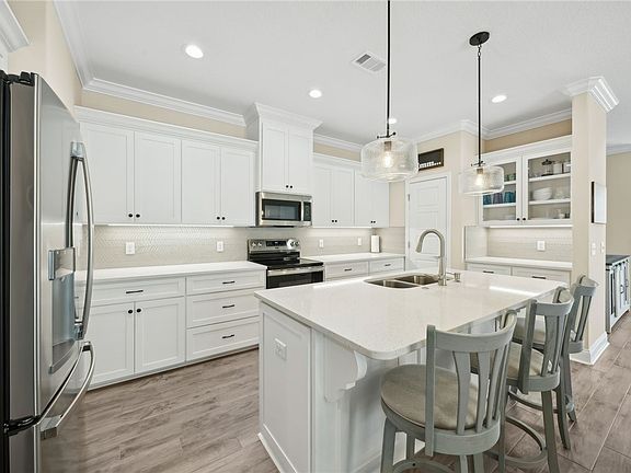 Experience the comfort and convenience of Laurel Landing, ideally located within the desirable Laurel Links Public Golf Community. This attractive single-family attached stucco villa is a builder-spec home that has only been lived in since June 2025 — offering the feel of new construction without the wait. Priced $4,000 under the original builder sales price, this home offers exceptional value — you can’t build it with all these upgrades for this price! The current owners have thoughtfully enhanced the home with upgrades including tile flooring in all bedrooms including the owner’s retreat (no carpet anywhere!), ornamental backyard fencing, blinds throughout, and a water softener system — valuable additions you won’t find in a standard build. The fenced yard borders a peaceful wooded area for extra privacy, and the covered patio with an extended open patio provides the ideal setting for grilling, dining, or simply enjoying the outdoors. Inside, tile flooring flows throughout the entire home for stylish and low-maintenance living. Crown molding and trey ceilings elevate the open layout, creating a refined and welcoming setting. The stunning kitchen features quartz countertops, stainless steel appliances, a spacious island, and a walk-in pantry — perfect for cooking and entertaining. The split-bedroom design ensures a quiet retreat in the spacious owner’s suite overlooking the backyard. The spa-inspired en-suite includes double vanities, a soaking tub, a large tiled walk-in shower, a private water closet, and a custom walk-in closet. Two additional guest bedrooms are located near the full guest bath, and the laundry room includes a folding counter and built-in shelving for excellent functionality. Residents of Ryan's Cove enjoy access to a sparkling community pool and amenity center overlooking a scenic pond, along with a nearby playground. The HOA covers lawn care and irrigation water — providing a low-maintenance lifestyle you’ll love. Conveniently located just minutes from Naval Submarine Base Kings Bay, I-95, shopping, dining, schools, Historic Downtown St. Marys, and Crooked River State Park — with easy commutes to Jacksonville, Brunswick, and beautiful coastal beaches. Don’t miss your chance to enjoy nearly new, move-in-ready living in a wonderful community — schedule your private showing today!