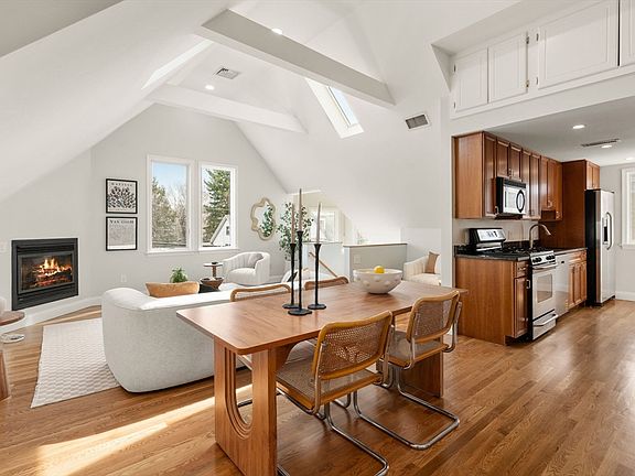 This sun-drenched top-floor condo is ideally located across from Danehy Park and near Huron Village, as well as vibrant Porter and Harvard Squares. Beautifully maintained, the home features newly refinished hardwood floors, a thoughtfully remodeled bathroom, and a bright, open layout. A private second-level entrance leads to a sweeping staircase that opens to the main living level, where skylights and a gas fireplace in the living room create a warm and inviting atmosphere. The kitchen is outfitted with custom cabinetry, granite countertops, a gas stove, and a brand-new dishwasher perfect for home chefs. Two spacious bedrooms offer comfortable living, and a cozy study nook provides a sunlit space to work from home. Ample storage includes an oversized front hall closet, generous eaves, and dedicated basement storage. A private roof deck offers the perfect retreat above the treetops. Don’t miss this rare opportunity to own a serene home in one of Cambridge’s most sought-after locations!