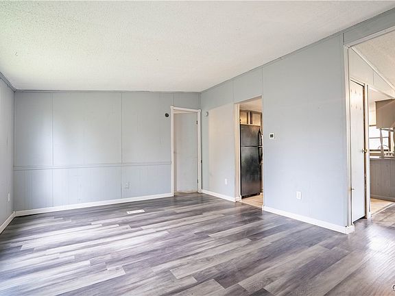 Step inside to a large open living and dining area with newer flooring and a stone fireplace as the focal point—perfect for cozy evenings or gathering with friends. Oversized windows stretch along the main living space, filling the home with daylight and views of the surrounding property. The kitchen offers generous cabinet storage, wraparound counter space, and an easy flow for everyday use.