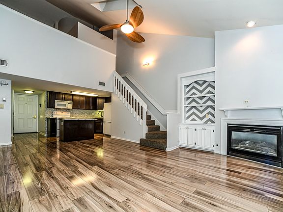 Nicely updated condo with open airy feel due to the soaring vault in great room. Tons of natural light too. First floor features wood type flooring, an open floor plan with breakfast bar, 1/2 bath, large dining area which also makes a nice home office, living room with fireplace & buiilt in, and a spacious balcony to relax or have your morning coffee. The lofted master is very large with lots of closet space and a large private bath. The community has a pool, a firepit conversaton area and a gazebo. This unit has 2 storage areas, one direclty beside unit and one at ground level. There is secure access and plenty of surface lot parking. The complex also has a small gym area and a meeting room you can book through condo association.