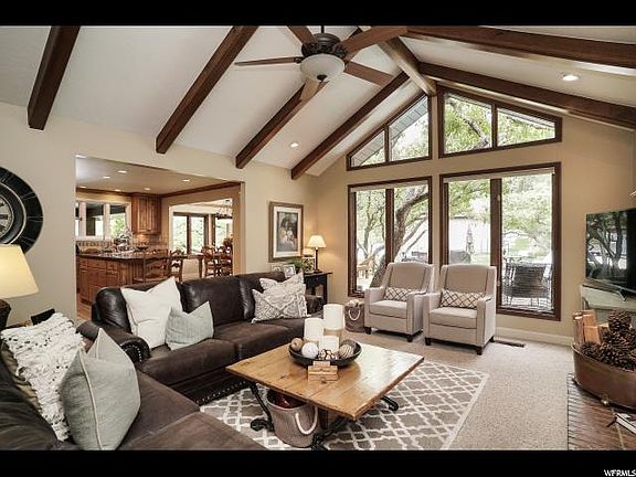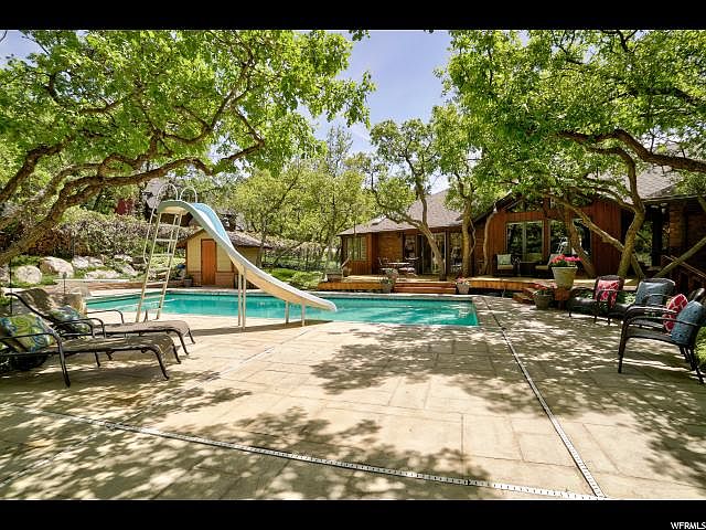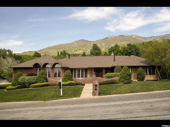 This exceptional property on the east bench has a lot of "WOW" factor inside and out! You won't find its match anywhere! These original owners built this home custom, and have beautifully updated it throughout, and meticulously cared for and loved it, but now sad that it's time for them to downsize. Besides being a great location, this home is immaculate, and offers lots of unique charm and seclusion too. Lots of space from the neighbors on all sides, and a cute little stream that runs along the property boundary line. Just note the sheer size of this home...every single room, bedroom, and bathroom is oversized...even the huge 1,155 sqft built-in garage! Front of home faces southwest, has lots of parking space, including room for RV too. Sharp curb appeal, brick rambler, with large enclosed open patio at the front of the house. You will be in awe as soon as you walk in the front door...very open living area; exposed beams and trusses; huge formal living room with lots of natural light; gorgeous formal dining room; spacious family room with vaulted ceiling, fireplace w/ mantel, and huge windows. Very large kitchen, beautifully remodeled to modern expectations...real maple hardwood flooring, large island, granite countertops, double ovens, custom cabinetry, and stainless steel appliances. Spacious semi-formal dining room surrounded by windows. Crown molding throughout the main level, as well as nice wood-cased windows and plantation shutters. Master suite has its own fireplace, a built-in desk, large windows, and access to patio. The enormous master bathroom is like a serene spa! It's incredible! Slate tile, Euro-shower with heat lamp, and one-of-a-kind spacious tub area with jacuzzi tub and skylight - MUST SEE! Basement has a large rec room area with recessed ceiling and dry bar with microwave and mini-fridge; separate family room area with stone surround gas fireplace and tiered seating for a "theatre room" setup. And finally, the backyard...picture perfect! Exp