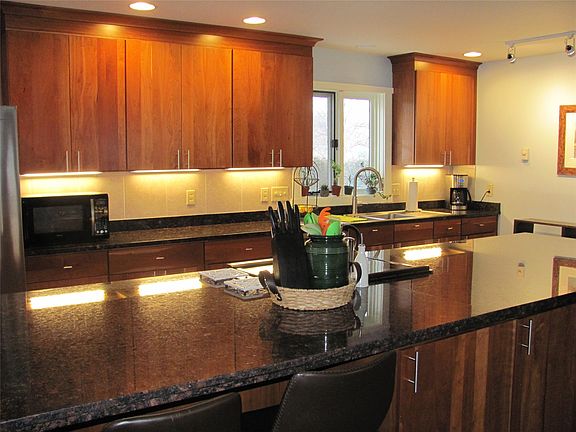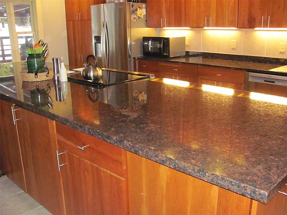 - Ceiling Fan(s), Eat-in Kitchen, Granite Counters, Kitchen Island, Open Floorplan, Stone Counters, Vaulted Ceiling(s)