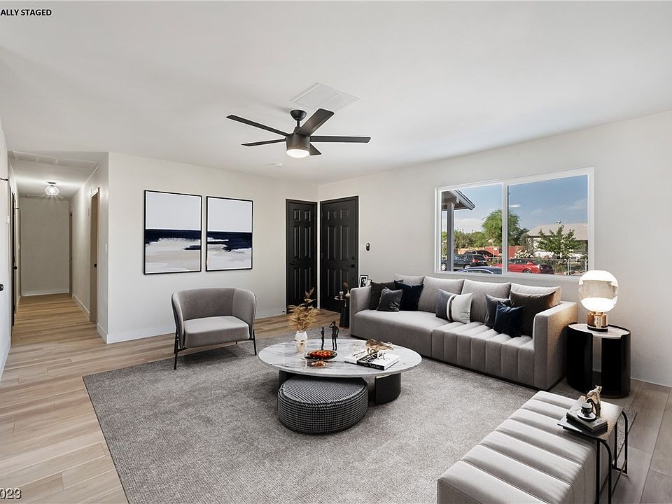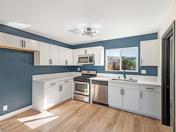 Newly remodeled, single-story, fully fenced home with 4 bedrooms, small RV parking, spacious backyard! Quick access to interstate 15, minutes from Nellis AFB and the entertainment, casinos and shopping of downtown Las Vegas! Custom kitchen with garden view, new white shaker cabinets, painted backsplash and stainless-steel appliances. Bathrooms have been fully upgraded with new vanities with framed mirrors, lighting, and modern tiled showers with niche. Home has gorgeous interior finishes, modern light fixtures, painted accent walls, laminate wood flooring and plush carpet throughout.