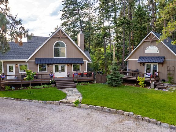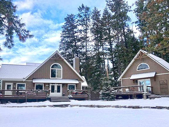 Located along the scenic 206 corridor in Columbia Falls, this Mountain Modern East Valley property offers exceptional versatility with multiple living spaces designed to adapt to a wide range of lifestyles. Set among mature trees with sweeping Columbia Mountain views, the property is ideal for multi-generational living, guest accommodations, rental opportunities, or a live-work setup. The 5-bedroom, 3-bath main residence features vaulted ceilings, a striking Glacier stone wood-burning fireplace, and French doors on every level that connect the home to its natural surroundings. The upper-level primary suite functions as a private retreat with balcony access, walk-in closet, soaking tub, and fresh mountain air. The main level offers open-concept living, dining, and kitchen spaces, two bedrooms (one with a private deck), a full bath, and laundry hookups—well suited for single-level living if desired. The walk-out basement expands the home’s flexibility with its own living room, kitchen, laundry, full bath, and two additional egress bedrooms, creating an ideal setup for extended family, guests, or independent living quarters. Adding even more functionality, the detached guest house includes a loft bedroom, full kitchen, bathroom, laundry, and generous storage—perfect for short-term or long-term rental use, hosting visitors, or housing a caretaker. Outdoor amenities support both lifestyle and utility, including two carports, a 30’x50’ heated shop, deer-fenced garden and farmyard, and a 50-amp RV hookup tucked into the trees. Recent upgrades include a 5-bedroom septic system (2020), Trane furnace (2023), water heater (2022), and pressure tank (2021). With no covenants or restrictions, this property offers rare freedom to customize, expand, or generate income—just minutes from Glacier National Park, Whitefish, and all the Flathead Valley has to offer.