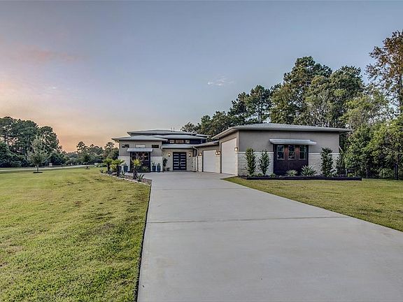 Welcome to this amazing contemporary custom home built in 2017 with polished concrete flooring throughout 1st floor, 4 spacious bedrooms, 4 full baths with floating vanities, commercial refrigerator, quartz island with seating for 4, dining area, next generation feel with two bedrooms downstairs and a full bath with walk in shower in proximity to downstairs guest room. Master includes two vanities, large walk in shower with two shower heads, amazing bathtub and huge closet. The patio adjacent to the living area is separated by full wall sliding doors that lead from the living are to the patio with a built in grill, sink and fridge, then to the outside through full wall sliding doors where you will enjoy a sunken fire pit with stone seating. Upstairs includes 2 bedrooms and 2 full baths, workout area/game room and media room with starlight ceiling. All of this beauty sits on 1.1 acres of lush green space. The garage is enormous with sink and bathroom with built in air compressor lines.