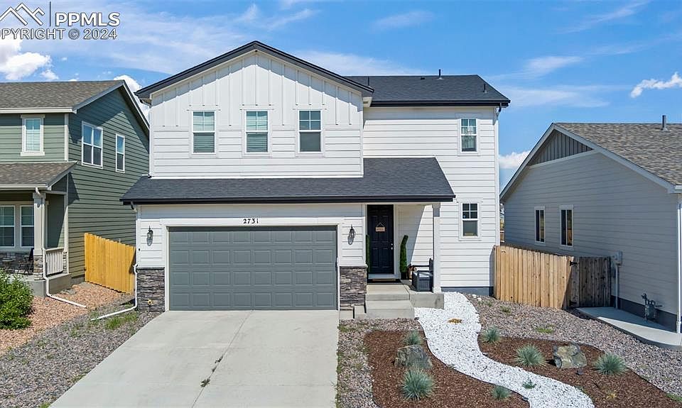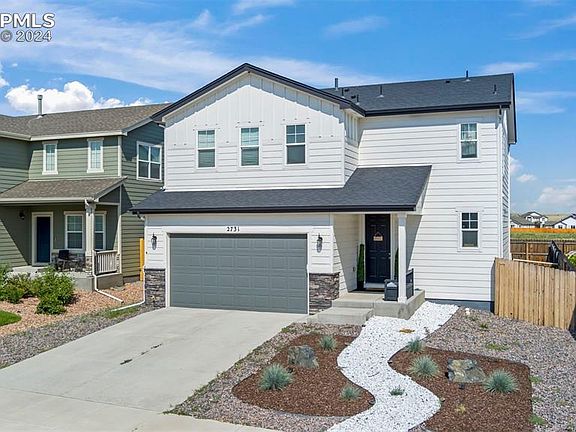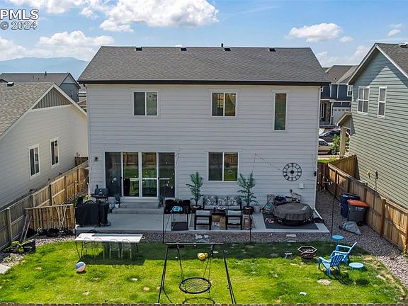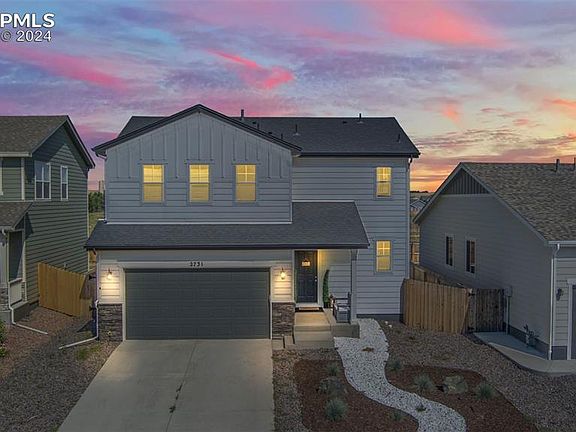 Discover the perfect blend of comfort and convenience in this beautiful 3-bedroom home built in 2020. Nestled in a prime location, this home backs to open space and offers easy access to Peterson Air Force Base, Schriever Air Force Base, and Fort Carson. Enjoy the luxury of being within walking distance to local grocery stores and restaurants, making daily errands a breeze. Step inside to an inviting open floor plan where the kitchen seamlessly flows into the living room, creating a welcoming space filled with natural light. The kitchen features a stylish island with a breakfast bar, perfect for casual dining or entertaining guests. The upstairs loft area provides a versatile space, ideal for a home office or kids' playroom. The large primary bedroom is a true retreat, complete with an attached bath featuring a double vanity. Outside, the fully fenced backyard offers privacy and security, while the extended concrete patio provides an excellent spot for outdoor relaxation or gatherings. The property is fully landscaped, ensuring beautiful curb appeal year-round. With a 2-car attached garage and modern amenities throughout, this home is ready to meet all your needs. Don’t miss the opportunity to make this conveniently located, well-maintained home yours!