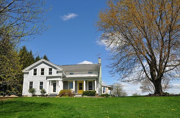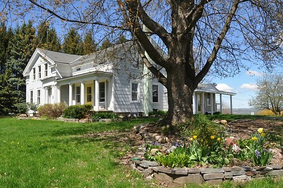 BACK ON MARKET! New septic field installed. A large Greek Revival home with two barns on 3 acres with a stunning vista and all an easy commute to Ithaca. 4 bedroom, 2 full bath home is a country classic. A sprawling 2-story home featuring a center hall curved stairs case, enormous kitchen, hardwood floors, built-ins, original details. New mud room entry, 2 heat systems, on demand hot water, distant valley views, established asparagus beds, rock walls, two large barns for storage, mature trees and partially paved drive. Needs work yet potential is endless. Private setting.