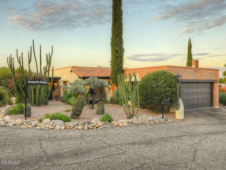Rare offering in Catalina Pueblo - one of the most coveted locations in the Catalina Foothills. This quaint & charming townhome community is nestled in the heart of the Catalina Foothills - offering a truly urban lifestyle & walking distance to upscale shopping, some of Tucson's finest restaurants and many outdoor activities including meandering walking paths, spectacular hiking trails & exceptional biking. Featuring two bedrooms & two bathrooms, this 1538 SF single story townhome creates an environment of warmth, sophistication and comfort, while offering classic, refined interiors. This serene retreat exudes character and charm with polished concrete floors, large great room with cozy wood burning fireplace, mantel, glass sliding doors & recessed lighting, & neutral paint. The gourmet kitchen is the perfect place to hone your culinary skills with striking Silestone counters, sleek appliances, custom shelving, pantry, vent hood, as well as newer range, dishwasher and flooring. Relax in the spacious master bedroom ensuite with a skylight, walk-in closet, dual vanities and a walk-in shower with gorgeous tile. Other features include a new roof, new hot water heater and an oversized two car garage. The impeccably landscaped courtyard welcomes you with vibrant bougainvillea, mature cacti, Texas ranger, barrel cactus, bird of paradise - and more. The expansive wrap around covered private patio is perfect for enjoying a morning cup of coffee, reading a good book, or watching the hummingbirds - truly offering the quintessential indoor/outdoor lifestyle so prevalent in Tucson. With rich architectural character & burnt adobe construction, this incomparable abode is sited on a premium corner lot and just steps away from one of the three community pools. Come and enjoy the best of what Tucson has to offer: a distinctive Foothills lifestyle + the urban option to walk to your favorite amenities in the highly desirable community offering unparalleled natural beauty in Catalina Pueblo.