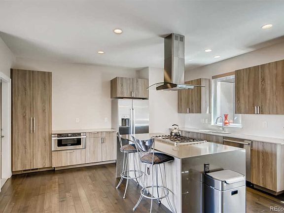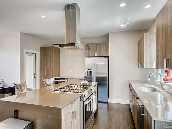 Stunning urban contemporary Townhome in the upscale Jefferson Park neighborhood. Built in 2015, this modern Townhome boasts three bedrooms, four bathrooms, and an amazing rooftop deck with fantastic views of the city and mountains. Upon entering, the lower bedroom with bath makes an ideal office or guest bedroom. Upstairs features an open and flowing floor plan with wood flooring throughout and the spacious living room, kitchen and dining area. Amazing Quartz countertops and waterfall Kitchen Island, soft close drawers and cabinets, Bosch appliances, upgraded LED lighting, smart thermostat, oversized windows providing great natural lighting, cozy gas fireplace and covered grilling balcony with natural gas hook up. The 3rd level features a large second bedroom and bath as well as the spacious master bedroom with new carpeting, walk-in closet with new wood flooring, and beautifully designed 5 piece master bath. Finally, another level up, enjoy the best of urban outdoor living on your private rooftop deck with stunning views of the city, mountains & Broncos stadium. Huntingtonâs rooftop decks have a staggered design for optimal views & privacy. Pre-plumbed for hot tub & grill. Walk or bike to nearby shops, restaurants, Jefferson Park, downtown & Broncos Stadium. Great opportunity to own in the hot Jefferson Park neighborhood.