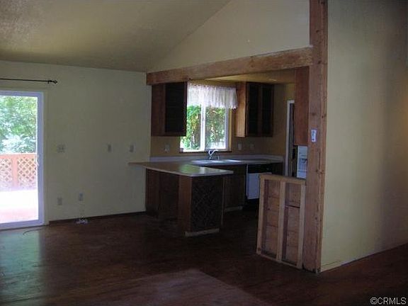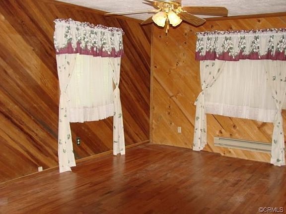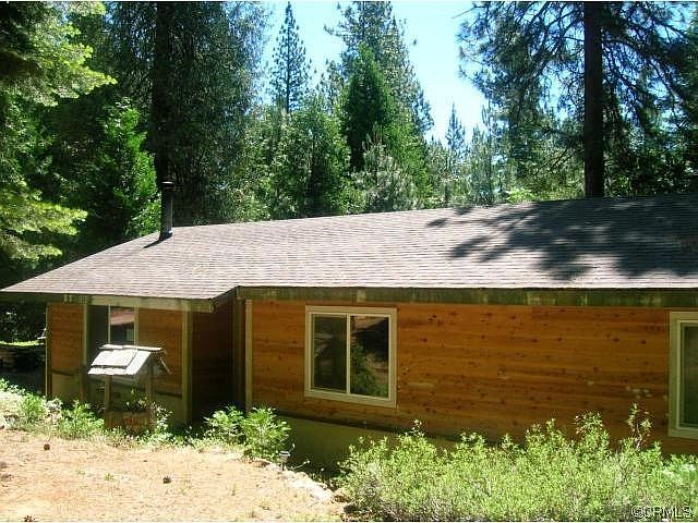 Cabin in the woods, river rock hearth, some knotty pine with an open dining/living room area. Outbuilding for storage.