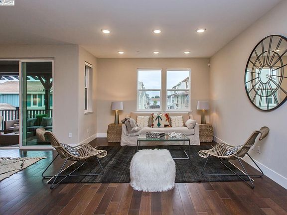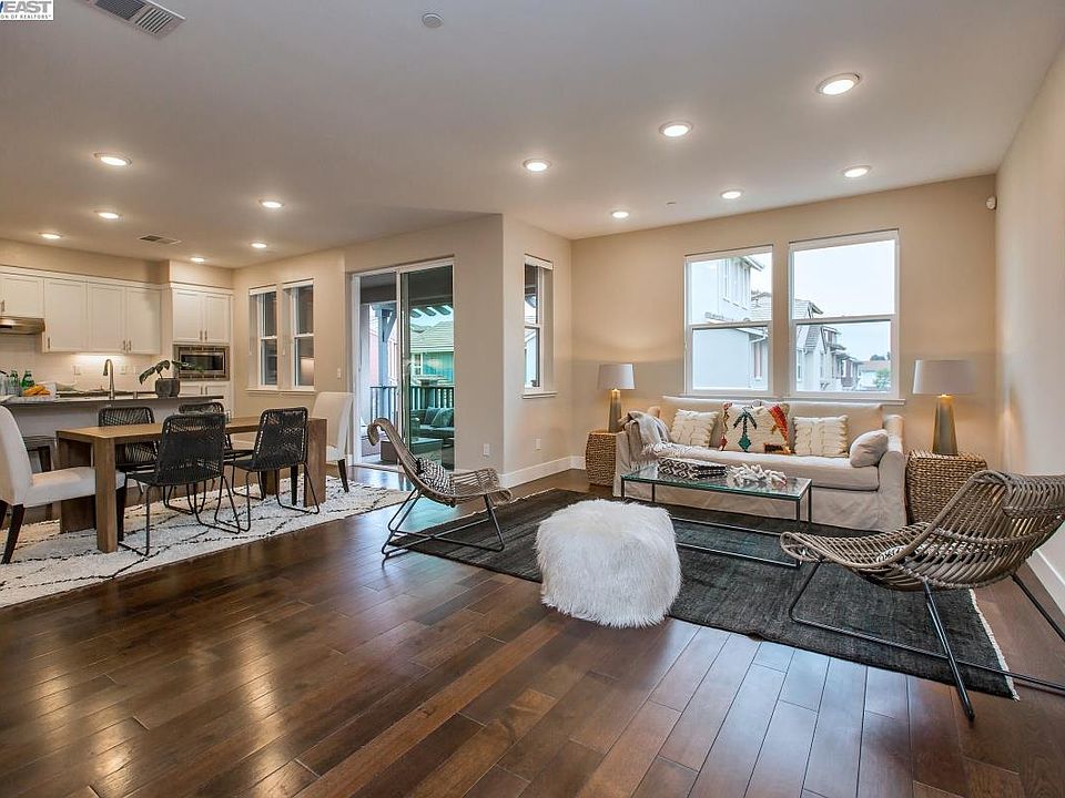 This elegant, "nearly new" condo was built in 2016 & offers spacious sophistication within a pedestrian-friendly urban village in Alameda's vibrant West End. Just steps from Alameda Landing & a complimentary BART shuttle, the home offers easy access to the Main St. Ferry to SF and Oakland, the Posey Tube, BART and I-880. This gorgeous home offers a modern great room with a living room, dining room, chef's kitchen, and has a large outdoor balcony patio. More than $50k in builder upgrades includes quartz counters in the kitchen/bathrooms, SS Bosch & LG kitchen appliances, hardwood floors, Hunter Douglas blinds, Minka light fixtures & much more. Designed with today's modern aesthetics and conveniences in mind, this sophisticated home includes integrated security & sprinkler fire systems, CAT-6 cable, dual-pane windows, & 9-ft ceilings. With an open floor plan, bright, airy rooms, the best in elegant finishes & many easy commuting options, this home has it all!