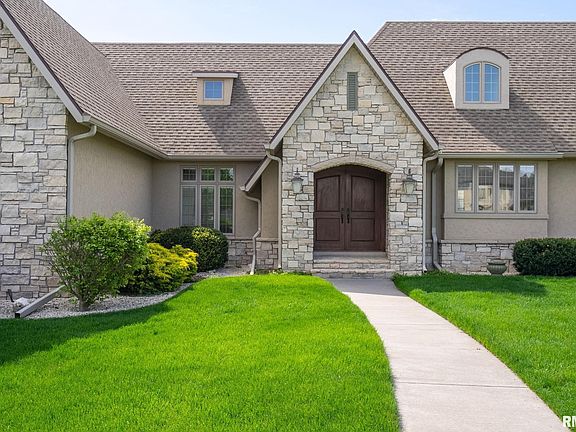 2733 Eagle Heights Court, Bettendorf, IA: Presenting a remarkable ranch home in Highland Green, this property offers expansive living and exceptional features. Step into the grand and inviting foyer, which seamlessly leads to the main living area. The great room boasts a cozy atmosphere with its vaulted and beamed ceiling, complemented by the warm glow of hardwood floors that extend through the kitchen and dining area. Built by Windmiller Design, this home showcases timeless craftsmanship and quality. Large windows throughout the dinette, sunroom, and great room frame stunning views of the beautifully landscaped, over-one-acre yard. The gourmet kitchen is a chef’s dream, featuring built-in Sub-Zero and commercial-grade appliances, a walk-in pantry, granite countertops, and a spacious island, making home cooking both enjoyable and efficient. For those who love to entertain, the covered deck with a gas fireplace offers a perfect setting to relax and enjoy the evening. The finished lower level includes two large bedroom en-suites, a fourth non-conforming bedroom, and a rec room leading to a covered patio. The lower level also features a wet bar with a Sub-Zero refrigerator, sink, and dishwasher, along with a billiard area, ample storage, and space for an exercise room. Additional amenities include a heated four-car garage and golf cart access to Crow Valley Country Club. This home is your private retreat from the demands of everyday life, offering both luxury and tranquility.