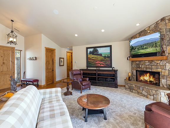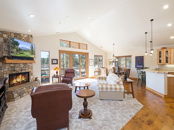 Located in a quiet cul-de-sac in Pine Canyon's Deer Creek neighborhood, this cabin offers privacy and easy access to the Clubhouse and its amenities. Views of the 1st green, fairway and the nearby lake can be taken in from the partially covered deck, which features a built in BBQ, or from the covered lower level patio which has an extra-large fenced dog run area. On the home's main level, a great room is highlighted by large window, vaulted ceilings and skylights to stream in natural light. Other main level features include an open floorplan connecting the great room which has a floor to ceiling stone fireplace, dining area and kitchen each have wood flooring throughout. The kitchen is complete with granite countertops, stainless steel appliances, a stone backsplash, and bar seating.