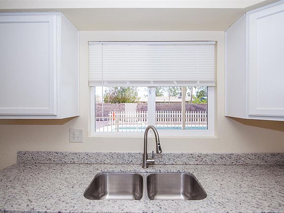 Tile floor newly installed throughout entire home. Dual pane windows. Pool with new plaster. Kitchen with white cabinets, granite counter tops, new stainless steel dishwasher, stove, microwave and deep kitchen sink with window overlooking full length covered patio and pool. Huge indoor laundry room with floor to ceiling cabinets opens to patio. Bathrooms updated with granite, tile tub enclosures, new vanities and toilets. Master bath opens to back yard for easy access from pool and patio areas. Nice home.