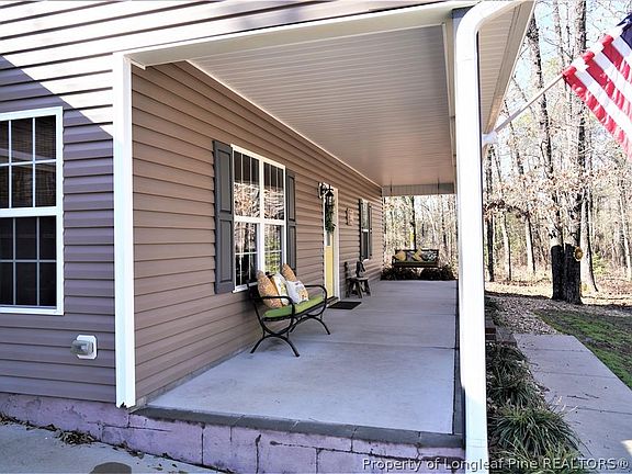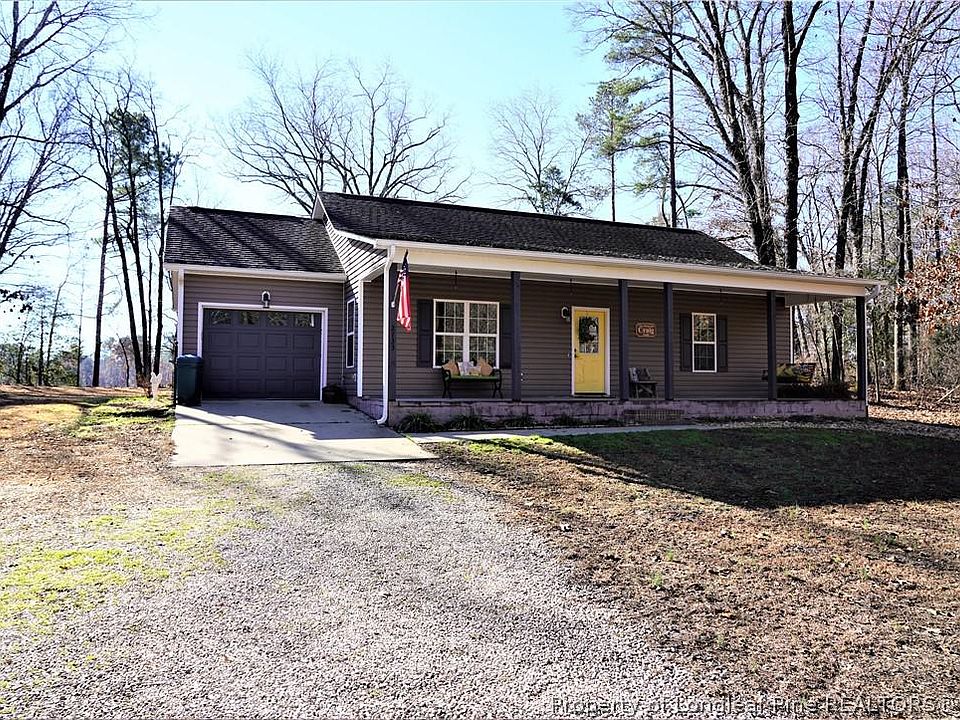 Enjoy your piece of the country life in this wonderful ranch home that sits on over an acre of beautiful partially wooded land and is located in the Harnett County area. As you pull up the tree lined driveway, you already feel like you are home. The large covered front porch is perfect for enjoying the nature around you. When you walk in this immaculate home you immediately see the beautiful LVP flooring (that runs throughout most of the home) and the stained wood beams that are a perfect accent in the great room. The kitchen has a tiled backsplash, walnut cabinets, and a pantry with country styled screen door. The main bedroom suite features a walk in closet, and access to the huge bathroom with tiled floor, large shower, farm styled faucet and a bowl sink. The second bedroom also has a walk in closet. The screened in back porch is a good size and overlooks the fenced in back yard. This home also has an attached single garage and wired outside storage building.