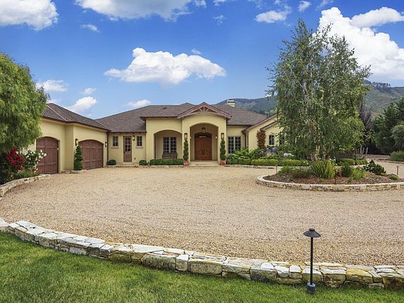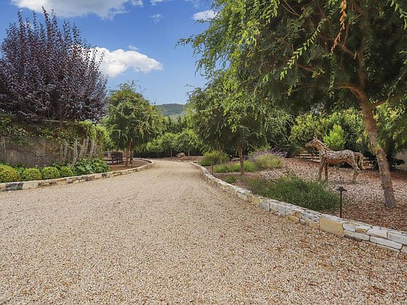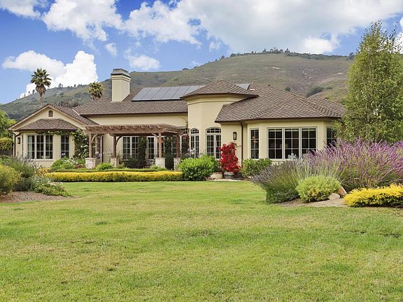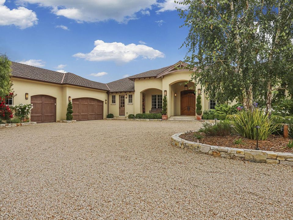 This private, gated estate is nestled on over four flat, lush acres in mid -valley and includes 2 vineyards - chardonnay & pinot grapes. A tree-lined drive leads to the one level 3800+ sq. ft. custom designed home which exudes warmth and quality. Offering four ensuite bedrooms, a chefs kitchen with walk in prep room/pantry, high ceilings with wood beams, open concept, radiant heat, and solar system. Also featured is private master suite with fireplace and a private garden. The covered pergola on the back patio overlooks beautiful drought resistant gardens and spectacular south facing views of the Santa Lucia Mountains. Additional value with deep private well, solar system, permit for guesthouse, and three car garage. This amazing home, location and quiet beauty of the setting make this property a must see!