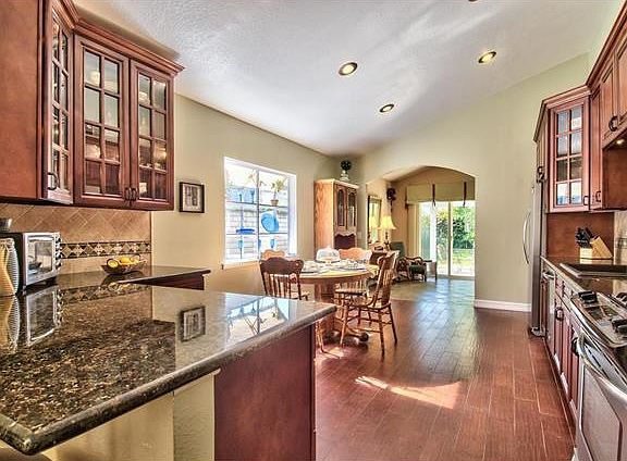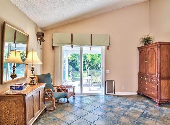 Spacious Open Concept Single Story Beauty! This customized La Familia model has it all with 1472 sq. ft. of living space. Featuring an expansive open kitchen and living room with an additional den, 3 bedrooms, 2 full baths. The master bedroom features a retreat and gorgeous french doors which invite you out to a peaceful garden oasis, patio cover with built in lighting and luxurious hot tub. Enter to vaulted ceilings spanning through out the living room and the beautifully remodeled kitchen featuring cherrywood finished cabinets with pullouts and soft closing drawers, granite countertops, custom designed tile backsplashes, smudge-less stainless steel appliances, a plant window and wood plank tile floors. Newer double pane windows, wood and gas burning fireplace, bay window with custom shutters, freshly painted interior and exterior, updated master and guest bathrooms, 2 car garage equipped with laundry facilities and storage cabinets make this home move in ready. Close to schools, parks, greenbelt and walking trails, Recreation Center with pool & tennis courts. Includes Mission Viejo Lake privileges.