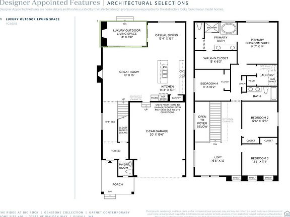 Welcome to the Garnet, a home where comfort meets contemporary elegance. Step into a spacious foyer that flows seamlessly into the great room, anchored by a sleek linear gas fireplace framed in striking floor-to-ceiling tile. Sunlight pours into the adjacent dining area, creating a warm, inviting atmosphere. Expansive stacking glass doors extend your living space outdoors to a covered patio, complete with its own cozy gas fireplace - perfect for year-round indoor-outdoor living. The gourmet kitchen is a chef s dream, featuring a large center island with a breakfast bar, sleek, contemporary flat-panel cabinets in a crisp white finish, extensive counter space, 5-burner gas cooktop, and a walk-in pantry. The space is anchored by luxurious Aviana quartz countertops, boasting a clean white background enriched with warm grey veining for a refined, high-contrast look. Upstairs, the serene primary suite is a luxurious retreat with a spa-like bath showcasing a dual-sink vanity, soaking tub, oversized shower, private water closet, and a spacious walk-in closet. Secondary bedrooms share a stylish, well-appointed bathroom and are centered around a versatile loft space ideal for a media area, playroom, or home office. Additional highlights include a convenient powder room, centrally located laundry room, and plentiful storage throughout. Disclaimer: Photos are images only and should not be relied upon to confirm applicable features.